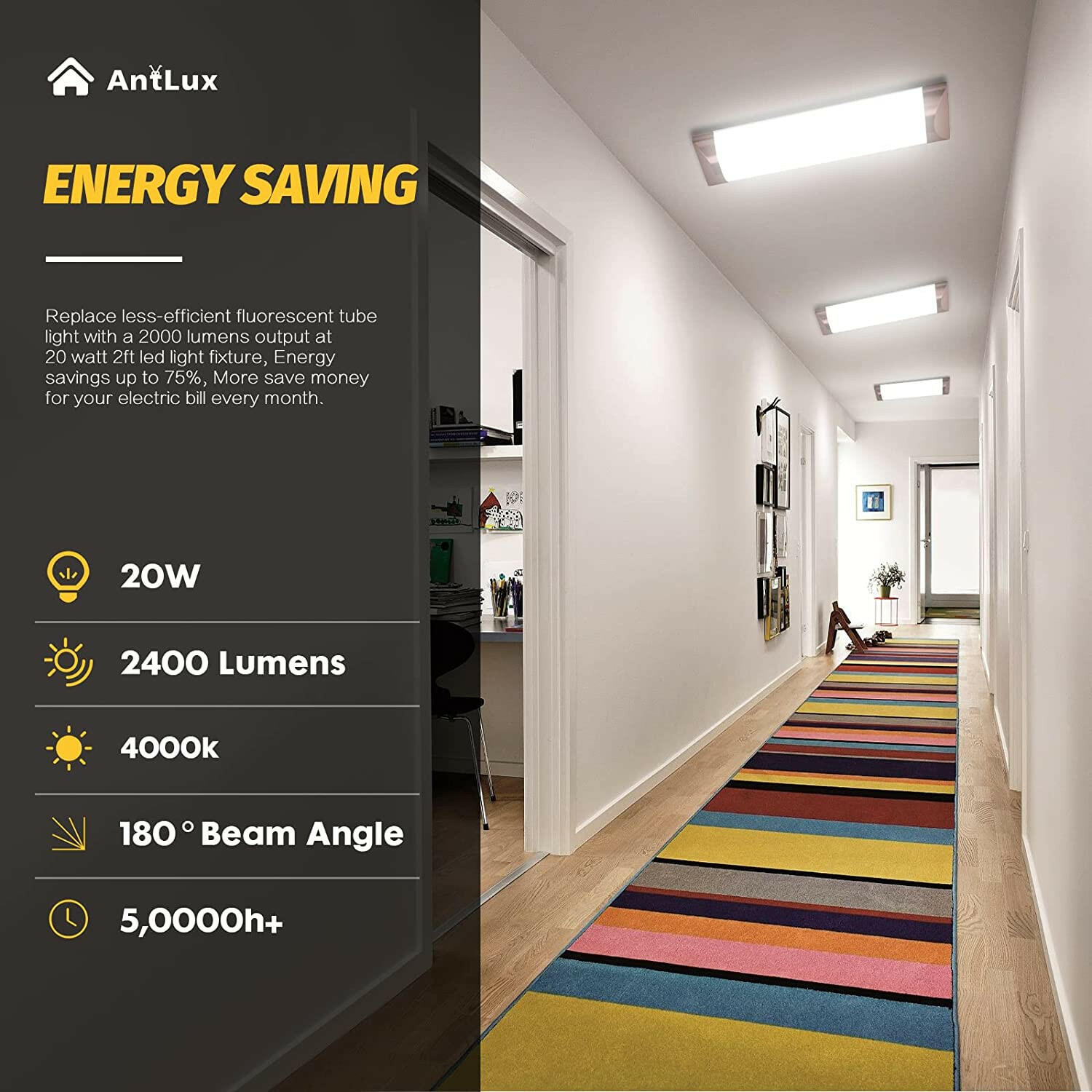 HIGH PERFORMANCE - AntLux LED 2ft light fixture provide 2400 lumens output at 20 watts, which is great option to replace less-efficient fluorescent or incandescent lights, energy saving and reduce 75% electric bill. Provides 50,000+ hrs worry-free operation.