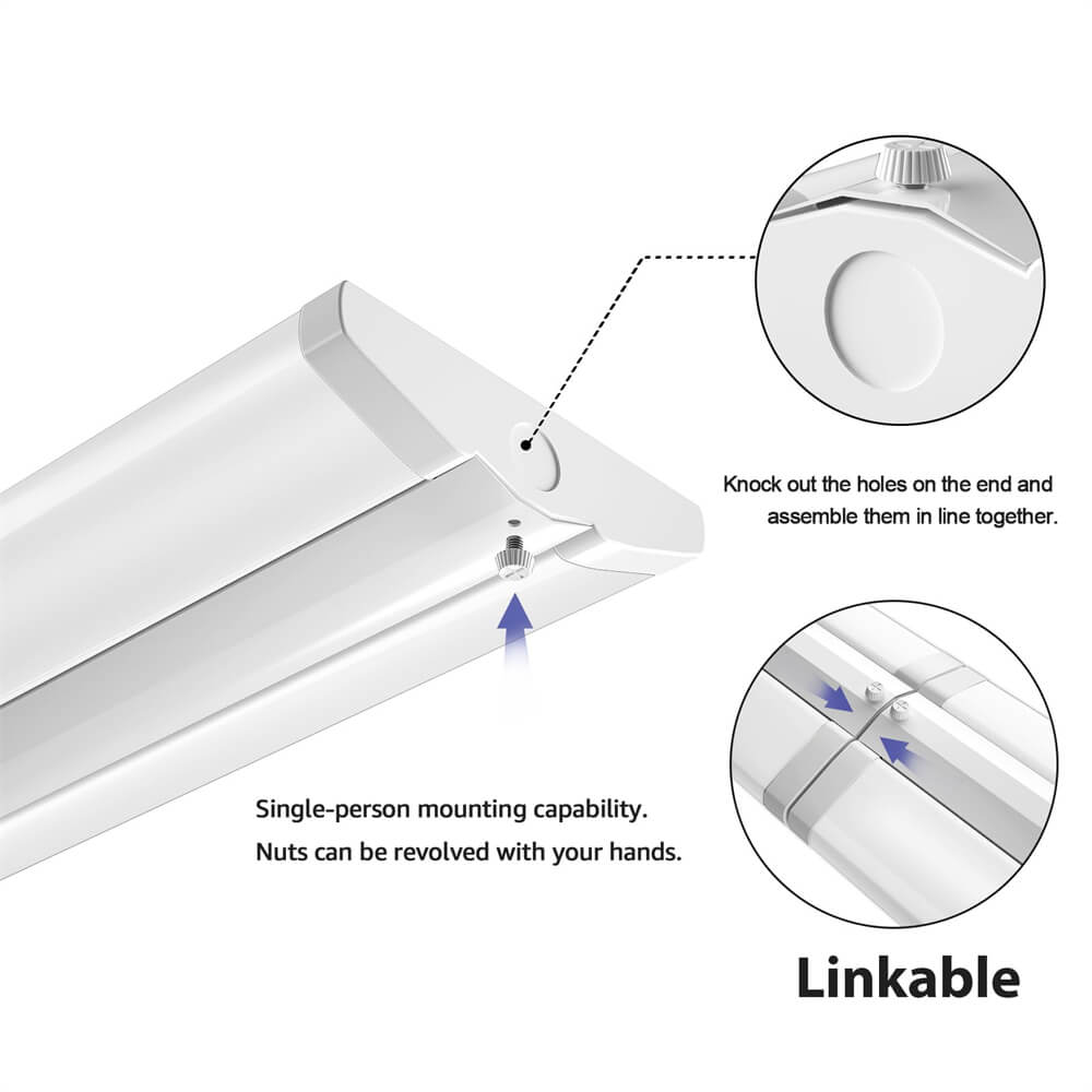 Easy and Fast Installation - The installation of 4ft led shop lighting is pretty straight forward. Instruction is clear and concise. It is a light weight unit, you can help it up and wired it single handedly, besides you do not have to take any lenses off to install these fixtures. They are a snap to assemble and disassemble. Linkable design can make it easy to install individually or continuously. You can link multiple lights one by one in line together. Very easy and fast installation to save your time and money.