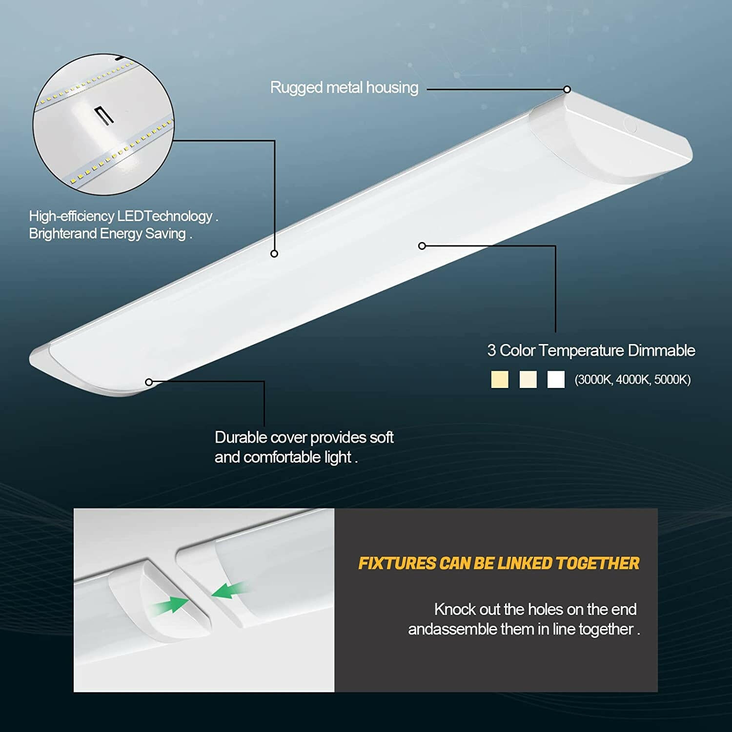 3 Color Temperatures & Dimming: These 4 foot LED lighting fixtures have three adjustable color-temperature settings from 3000K to 5000K, for warm white, natural white, and daylight white light( No Dimmers Required). You can choose any temperature to create the most suitable lighting for your activity or environment like kitchen, laundry room, warehouse, workshop, hallways, garage, office, and so on.