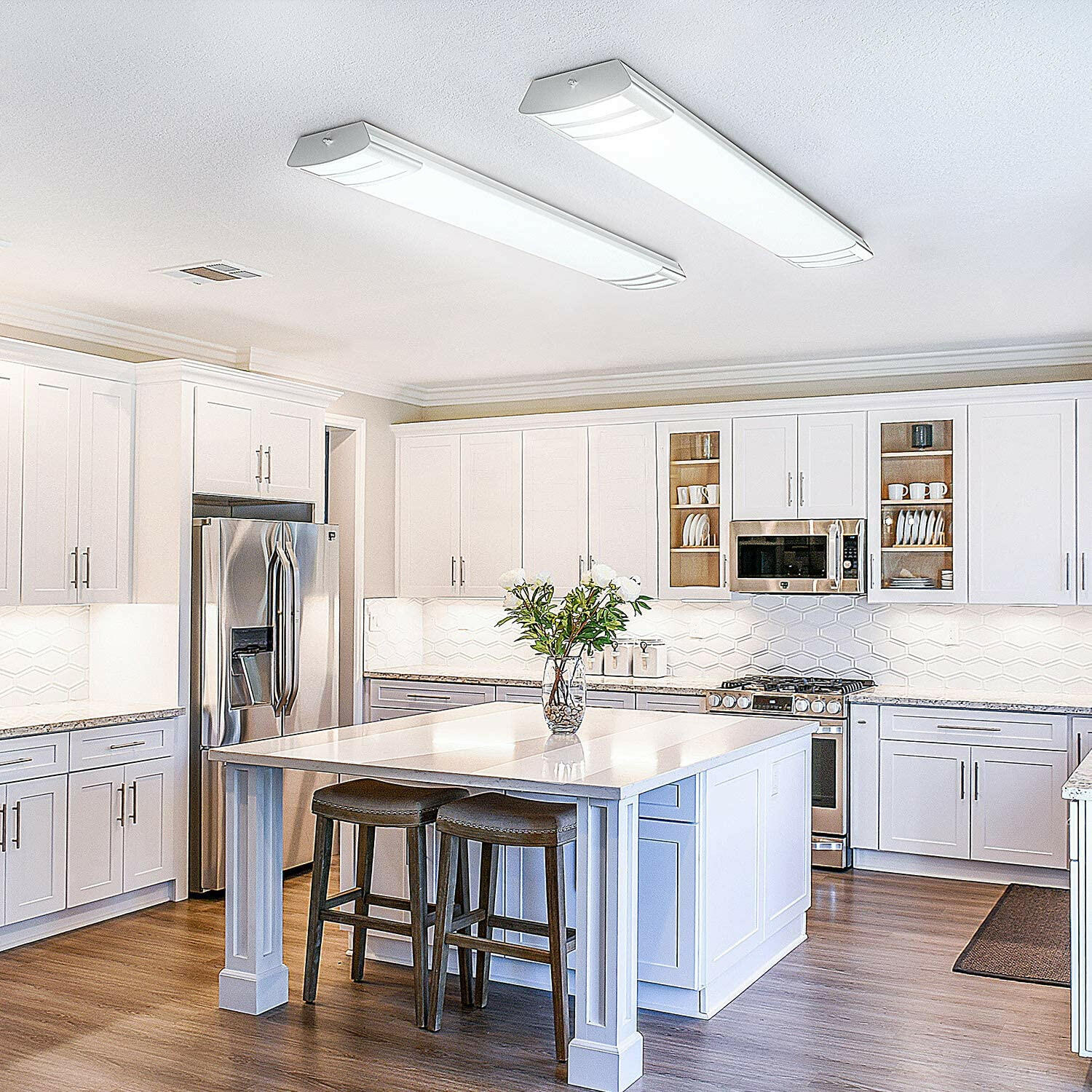 ELEGANT DESIGN - The LED kitchen ceiling light fixtures with decorative end caps, and frosted cover emits soft and comfortable lighting. No glare, flickering or spot dot, uniform illumination. Protected your eyes from uncomfortable lighting.