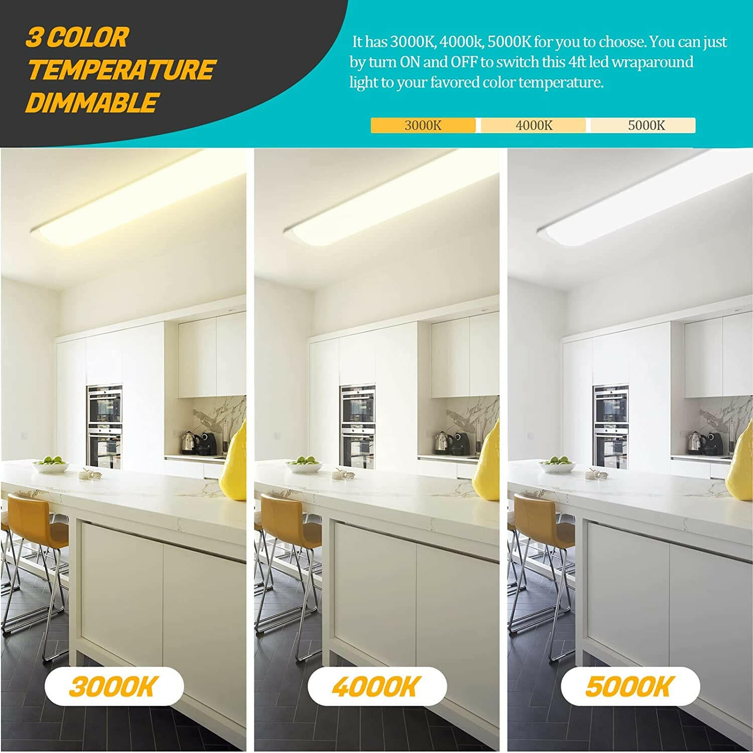 3 Color Temperatures & Dimming: This 4 foot LED ceiling lights has three adjustable color-temperature settings from 3000K to 5000K, for warm white, natural white, and daylight white light( No Dimmers Required). You can choose any temperature to create the most suitable lighting for your activity or environment like kitchen, laundry room, warehouse, workshop, hallways, garage, office, and so on.