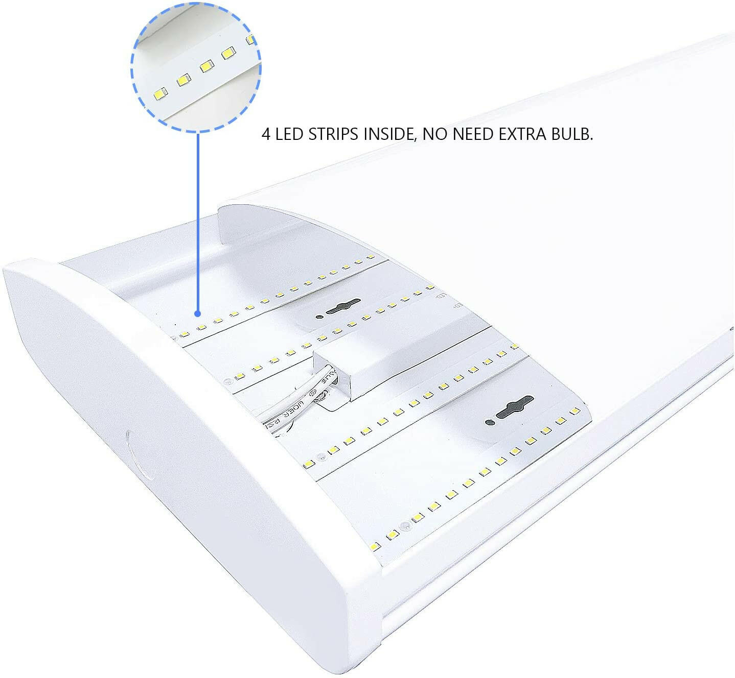LINKABLE – There are 2 holes on each end. Knock out on ends and assemble the lights in line together (up to 10). Easy to install. The integrated 4ft linkable LED shop light include led strips inside each fixture. No extra bulbs needed!