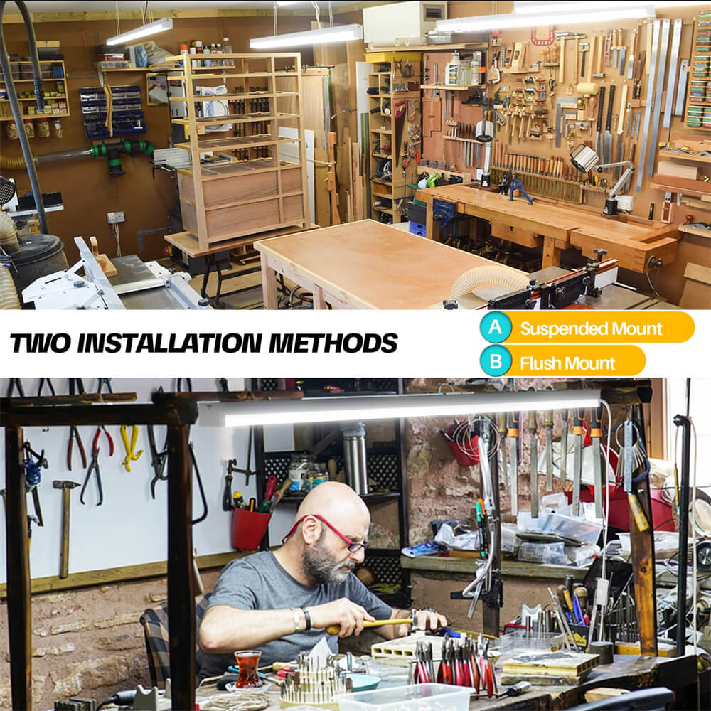 EASY INSTALLATION AND VERSATILE - Both hanging and surface mount are available with all necessary hardware. Very easy and fast installation to save your time and money. With compact design, these 4ft led ceiling lights are ideal for garage, workshop, retail shop, car shop, supermarket, basement, workbench, utility room, storage room, barn, closet and replacing fluorescent versions.