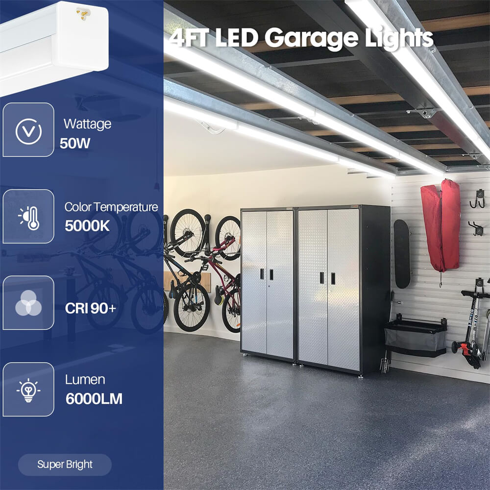 VERY BRIGHT & OVER 75% ENERGY SAVING - The 4ft led garage lights provides 6000 lumens output at 50W with high efficiency, which is great option to replace traditional T8 fluorescent tube light or other less-efficiency traditional lights. Reduce over 75% electric bill with 50,000 hours of maintenance-free operation.